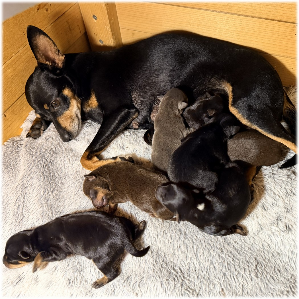 Tina à ainsi donné naissance à 6 jolis bébés Pinscher Nain, dont deux d'entre eux sont de couleur chocolat, couleur non encore admise au standard mais qui arrive parfois comme il est possible de voir la couleur bleue apparaître de temps en temps, dont