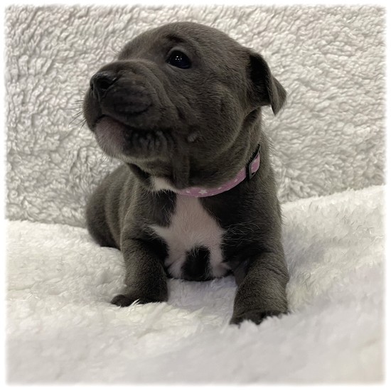 Cette petite femelle Staffordshire Bull Terrier de couleur Bleu intégral (Samba) est la plus petite et la plus caline de la bande.