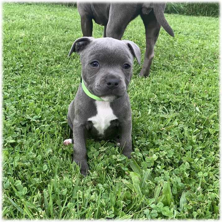 Ce petit mâle Staffordshire Bull Terrier de couleur Bleu et poitrail blanc est un amour de petit garçon.