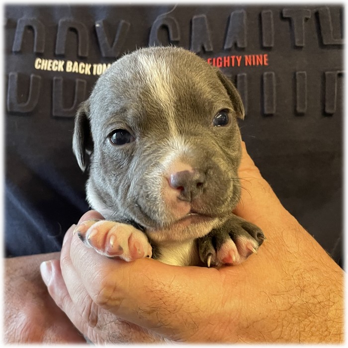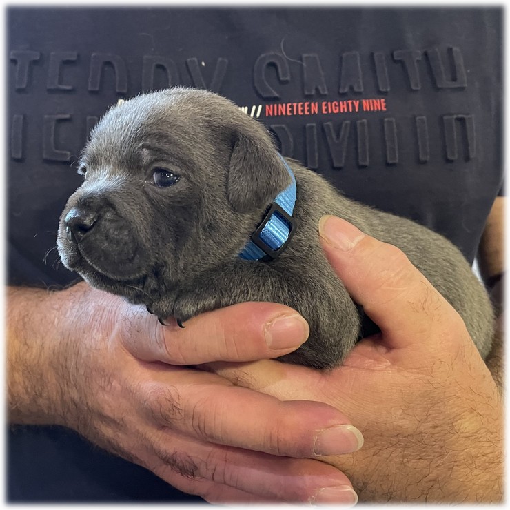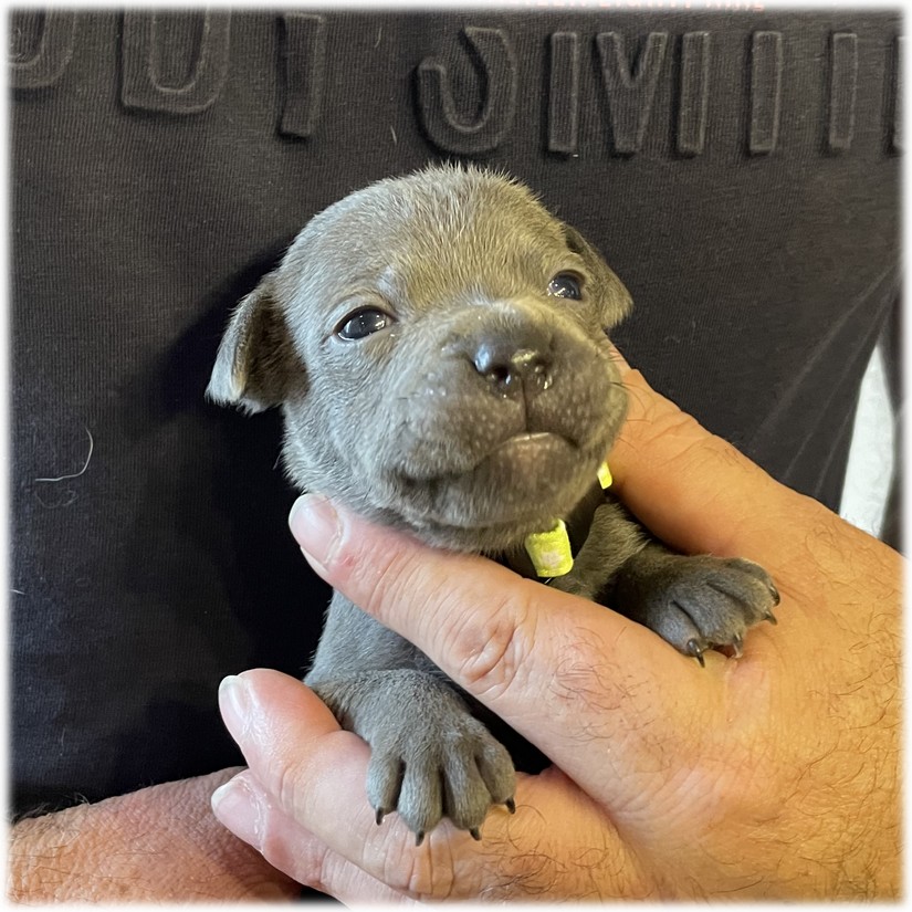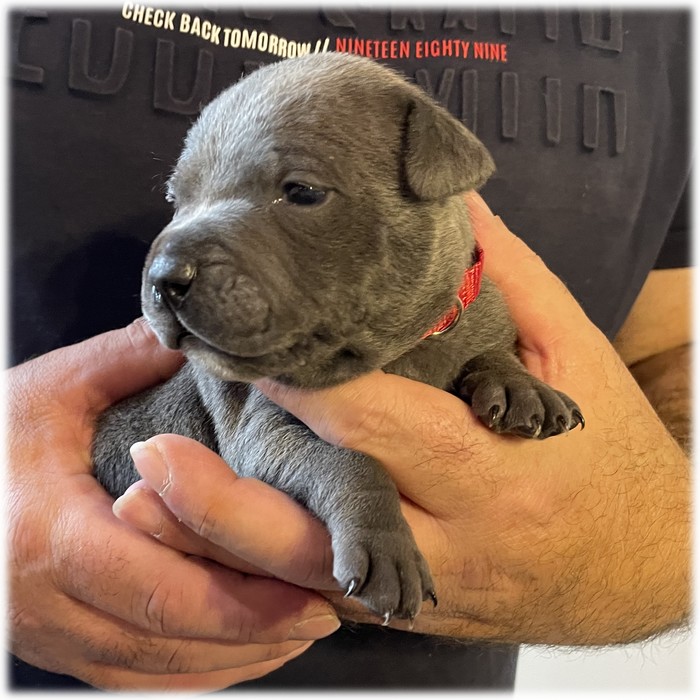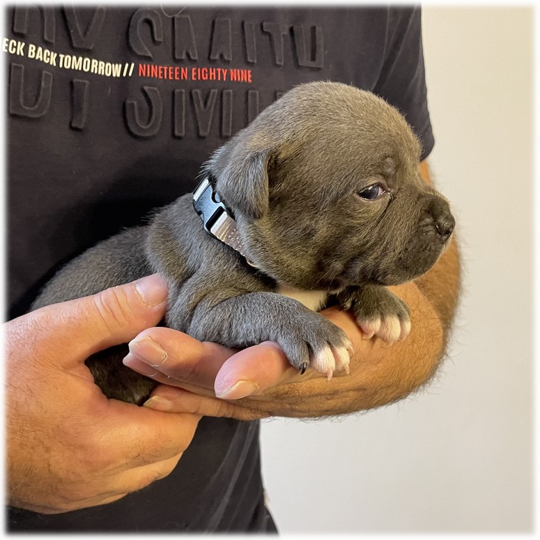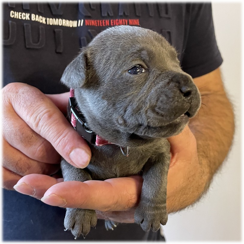 Ce petit mâle Staffordshire Bull Terrier de couleur Bleu (Venom) est réservé à compter du 13/11.