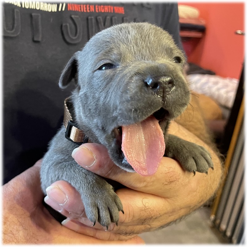 L'élevage du Domaine de Mondon est heureux de vous annoncer la naissance des bébés de Chloe, femelle Staffordshire Bull Terrier de couleur bleu de notre élevage.