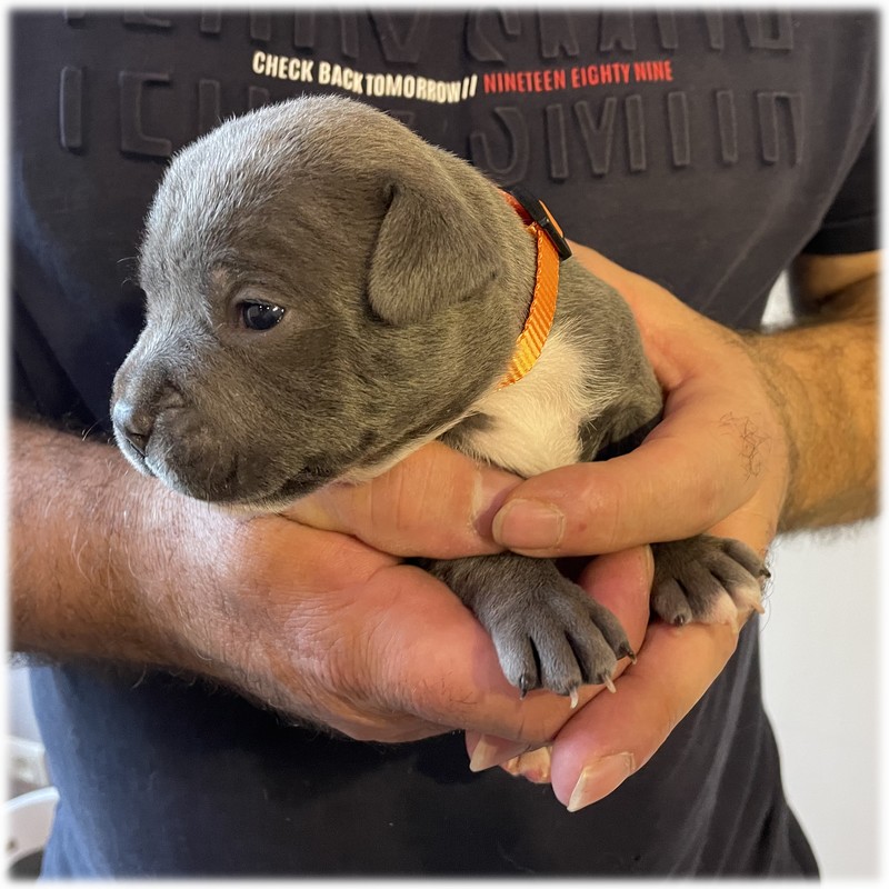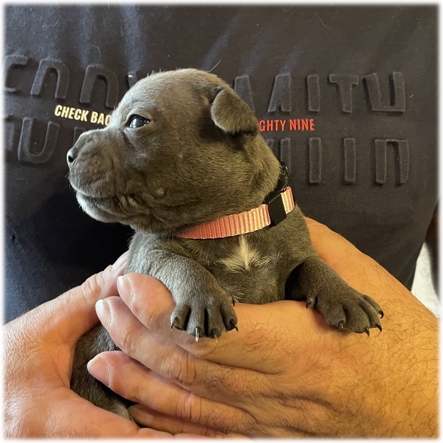 Cette petite femelle Staffordshire Bull Terrier de couleur Bleu (Héra) est une des plus grosses et intégralement bleue.