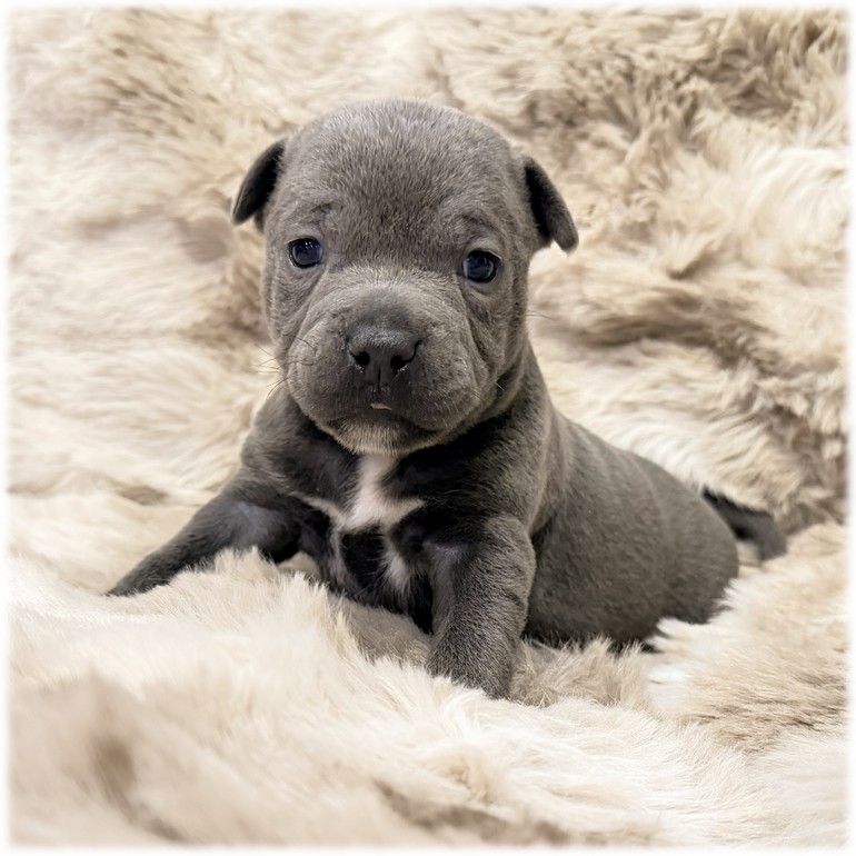 Athor représente la 3ème génération de nos Staffordshire Bull Terrier Bleus LOF et elle vient de donner naissance à ses premiers bébés, au nombre de 4, qu'elle à eut avec notre jeune papa Staffie Bleu LOF.