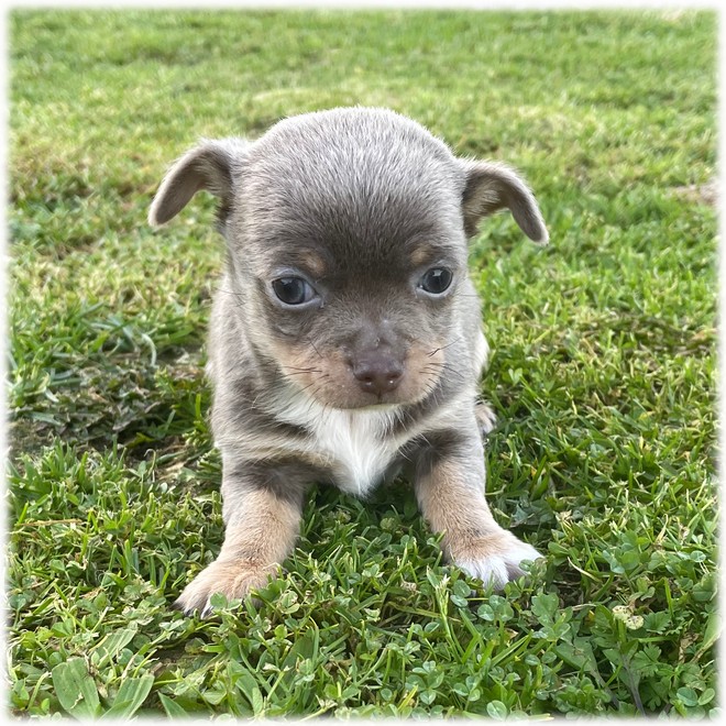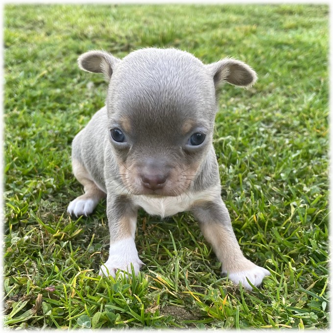 Ce petit mâle Chihuahua de couleur Bleu lavande (Léon II) est un petit mâle adorable, très affectueux et très calin.