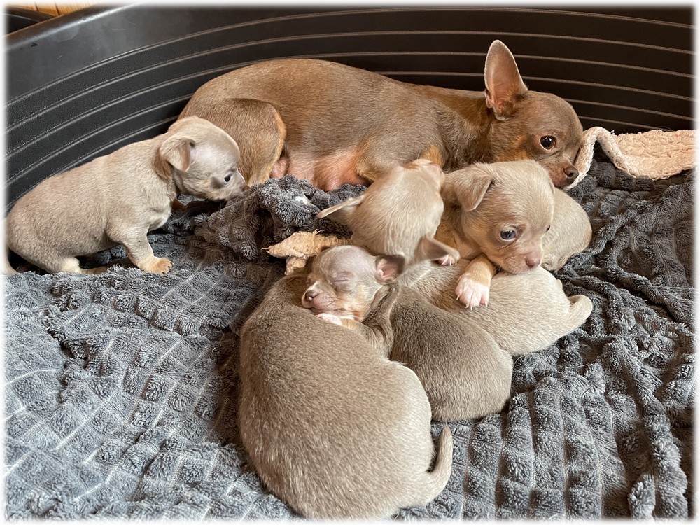 L'élevage du Domaine de Mondon est heureux de vous annoncer la naissance des bébés de Peewee, femelle Chihuahua de couleur bleu lavande de notre élevage.