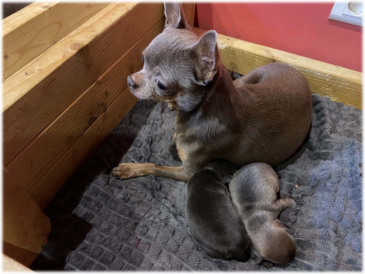 L'élevage du Domaine de Mondon est heureux de vous annoncer la naissance des bébés de Peewee, femelle Chihuahua de couleur bleu lavande de notre élevage.