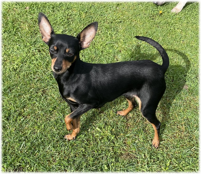 Cette petite femelle Pinscher Nain de couleur Noir et Marron (Shaï) à déjà le caractère du pinscher, aventurière, joueuse et très affectueuse.