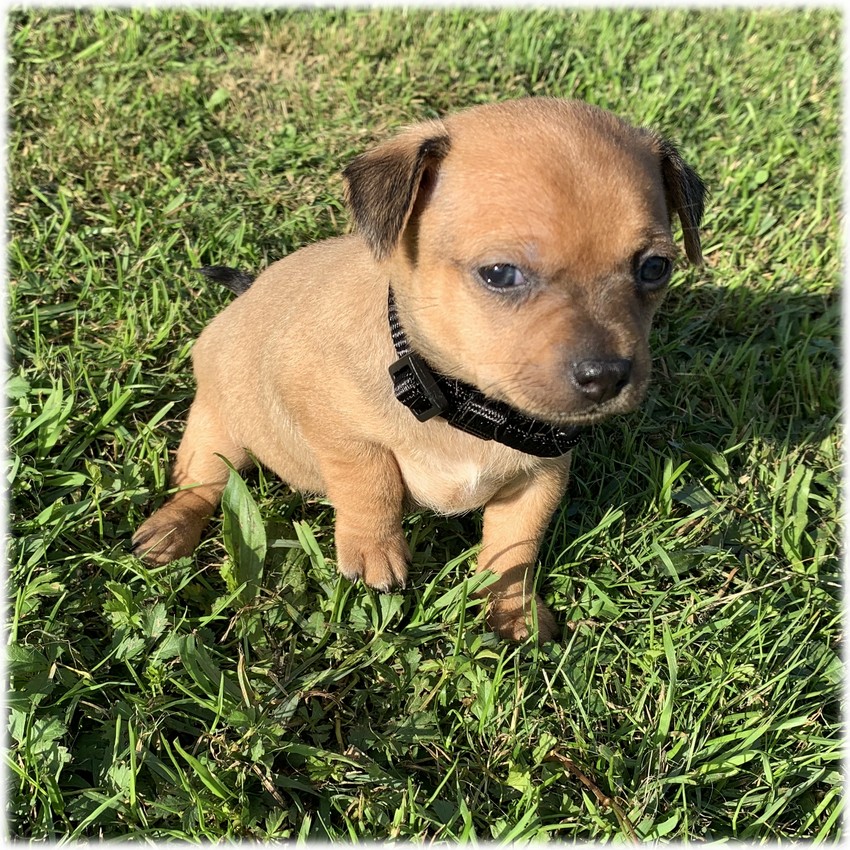 Ce petit mâle Pinscher Nain X Chihuahua de couleur Feu (Coco) est le plus gros de la portée et le plus autonome.