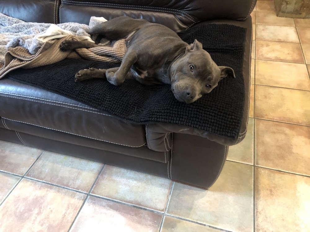 Cette petite femelle Staffy de couleur Bleu intégral (Sarah) est une petite fille très sage pour l'instant, à voir dans le temps si elle reste sage ou pas...