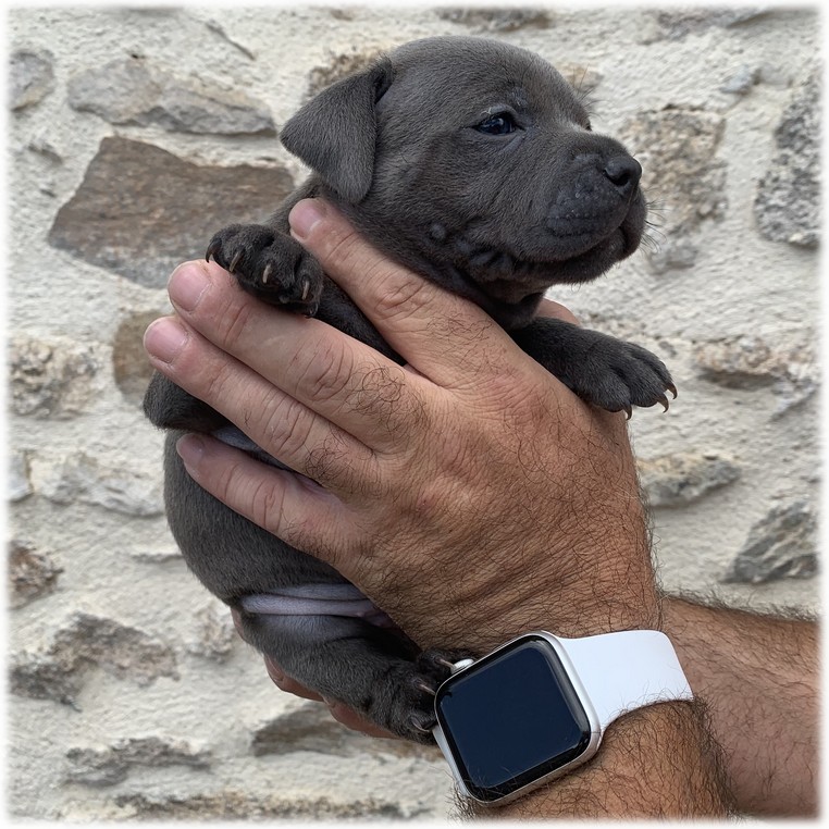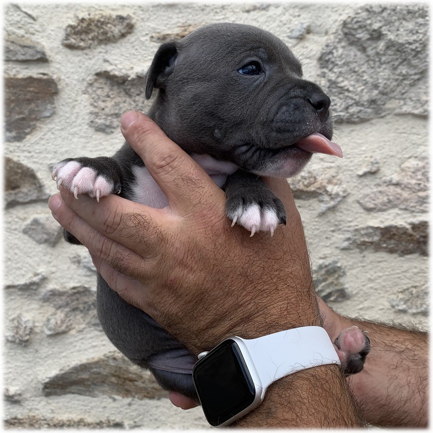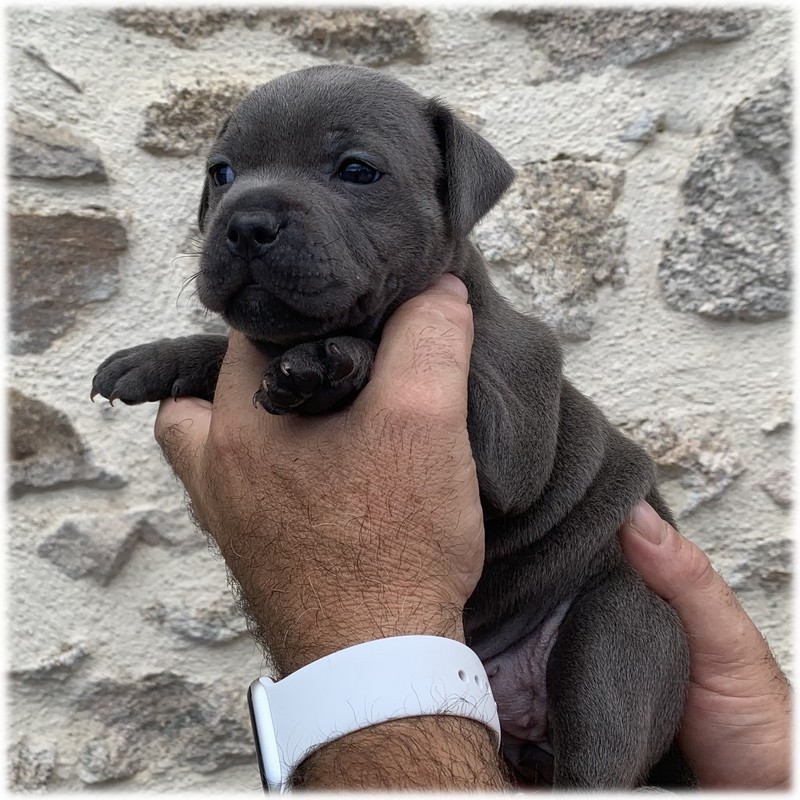 Ce petit mâle Staffy de couleur Bleu intégral (Saphir) est un petit toutou très sage et timide pour l'instant mais déjà calin comme les petits mâles...