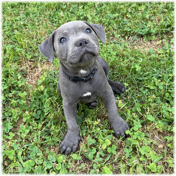 Ce petit mâle Staffordshire Bull Terrier de couleur Bleu (Tomy) est l'un des plus gros de la portée mais tres doux avec ses frères.