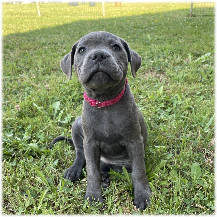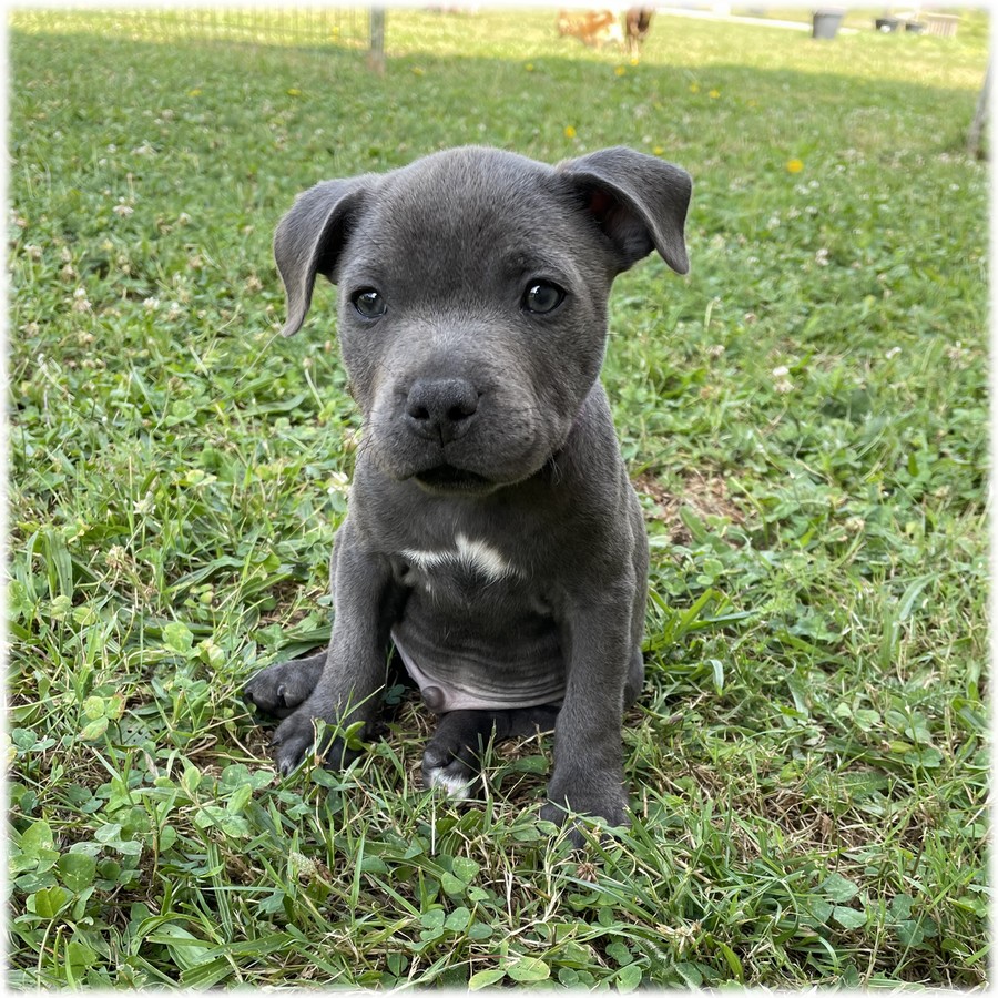 Cette petite femelle Staffordshire Bull Terrier de couleur Bleu (Tina) est la plus petite des 3 petites filles et la plus douce.