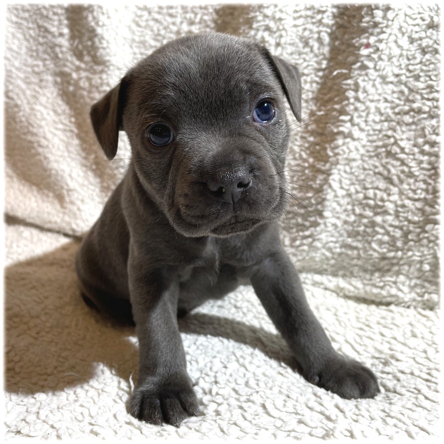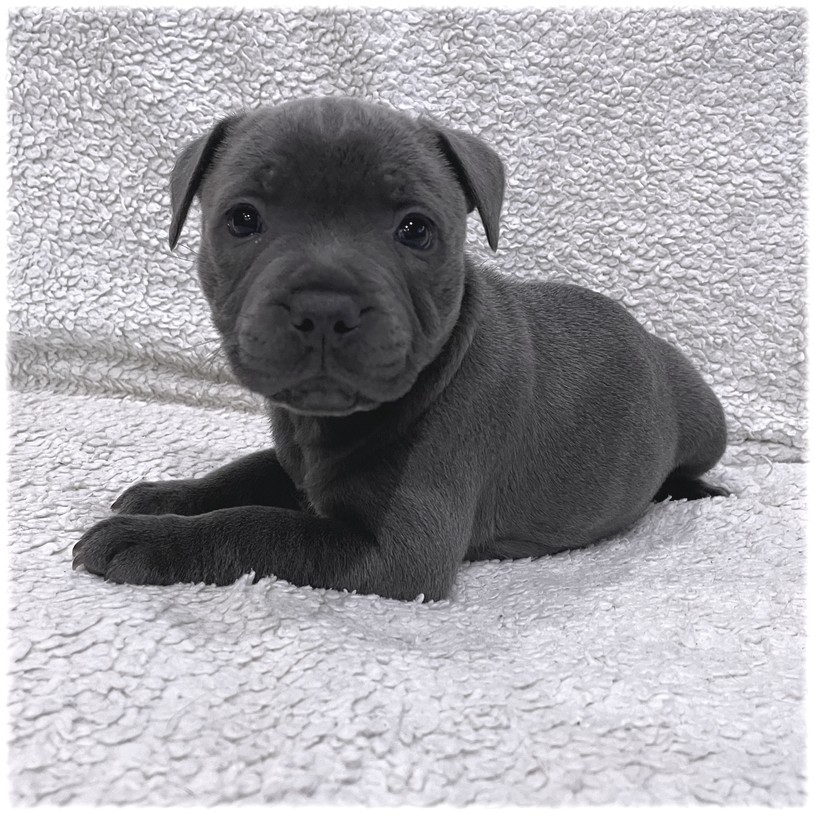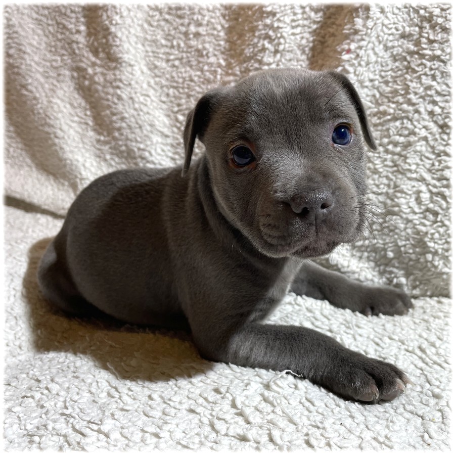 Ce petit mâle Staffordshire Bull Terrier de couleur Bleu (Twix) est assez joueur avec ses frères et soeur.