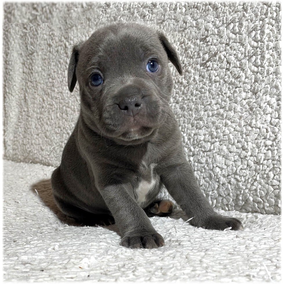 Ce petit mâle Staffordshire Bull Terrier de couleur Bleu et blanc (Thor) est le plus petit de la bande tout en étant le plus joli de l'année. Le blanc fait le tour du cou complet. Vidéo sur demande.