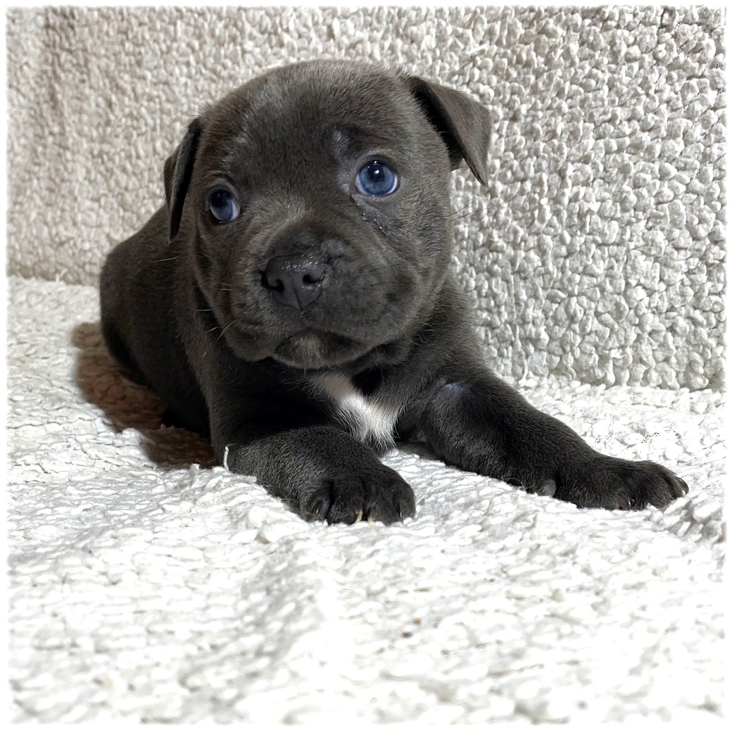 Cette petite femelle Staffordshire Bull Terrier de couleur Bleu foncé (Tiffany) est la plus joueuse de la portée.