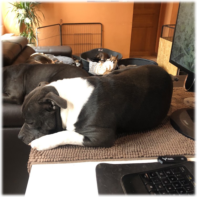 Maman très décontractée, Isis ne va voir ses bébés que pour les allaiter et préfère son petit confort personnel sur un canapé mais à portée de ses bébés tout de même. Les chiots sont nés le 15-12-2022, et tout le monde se porte très bien.