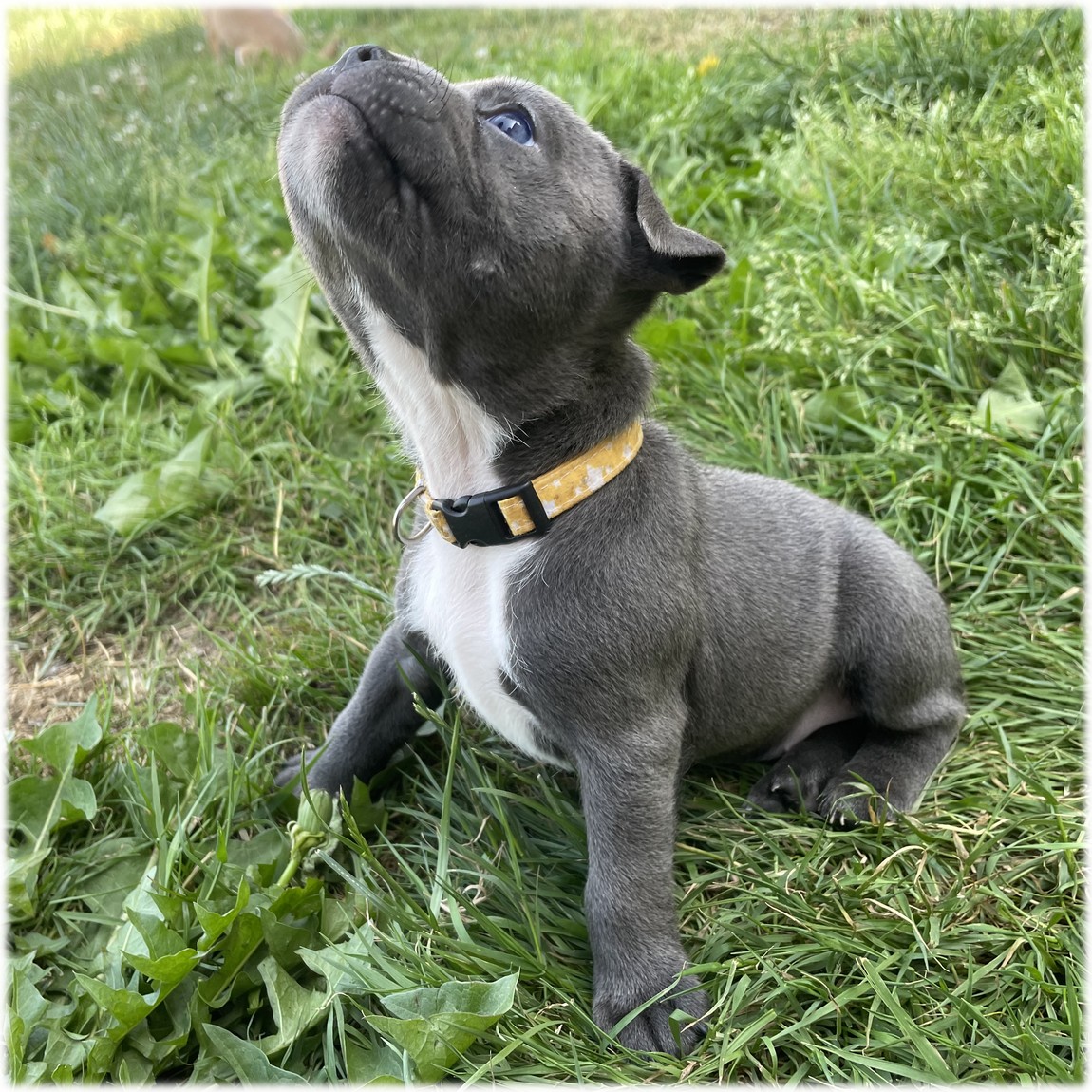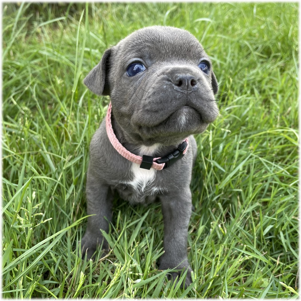 Cette petite femelle Staffordshire Bull Terrier de couleur Bleu (Nova) est la plus petite de la portée et la plus aventureuse de la bande.