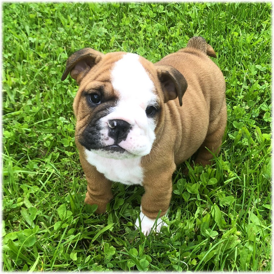 Ce petit mâle Bulldog Anglais de couleur Fauve & Blanc (Stan) est très vivant et il adore jouer avec d'autres toutous. Un toutou déjà très autonome.