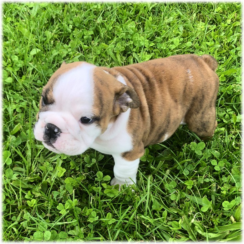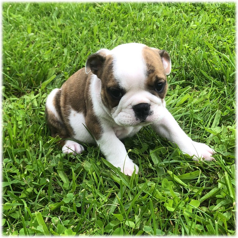 Cette petite femelle Bulldog Anglais de couleur Bringé & Blanc (Sarah) est la plus timide de la portée. Elle aime aller dehors mais accompagnée...
