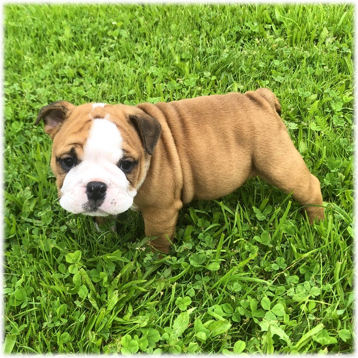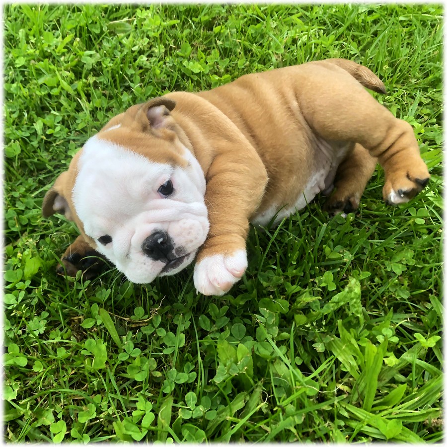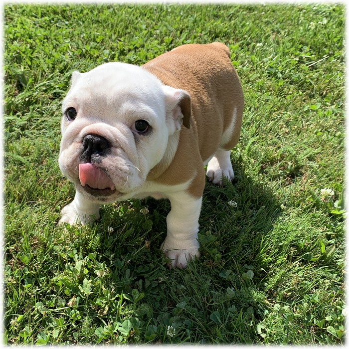 Ce petit mâle Bulldog Anglais de couleur Fauve & Blanc (Sally) est le plus doux de la portée. Il est plutôt discret pour l'instant.