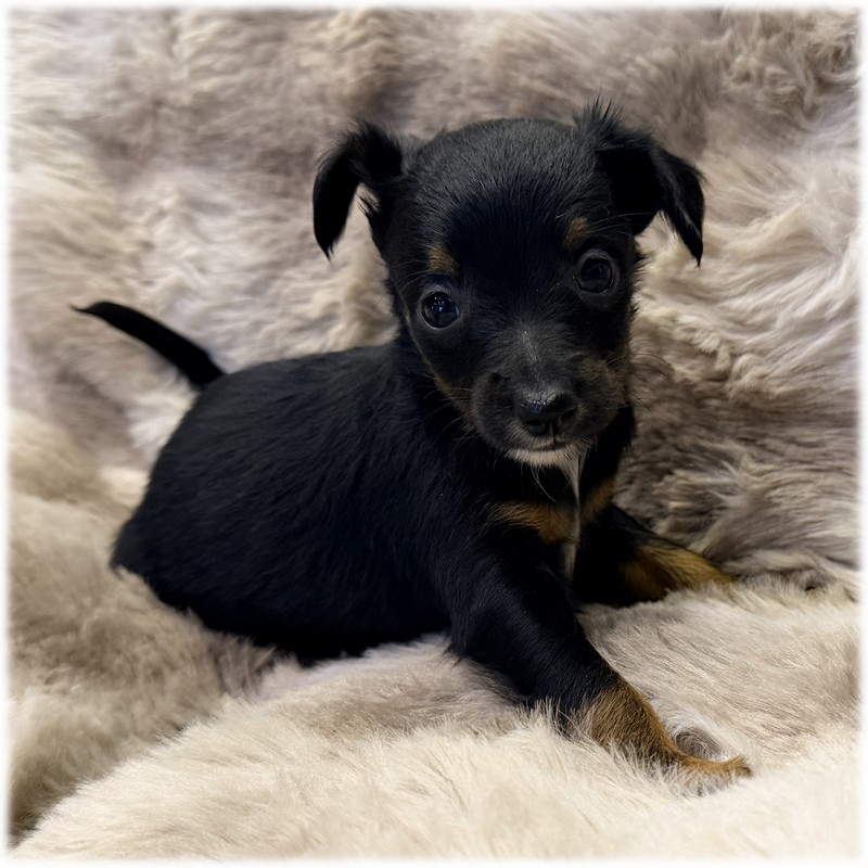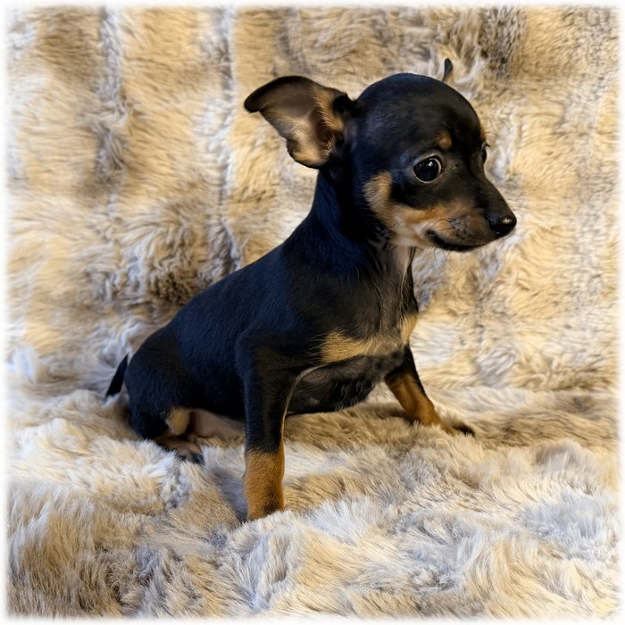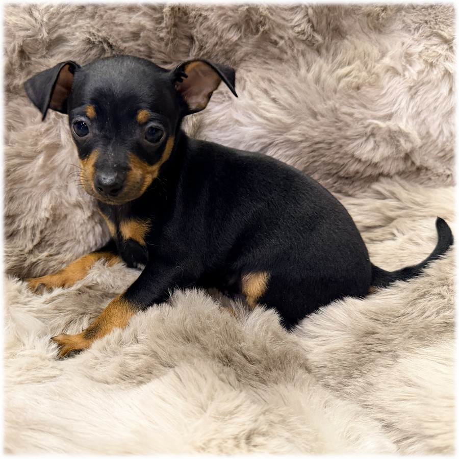Ce petit mâle Pinscher Nain de couleur Noir et feu (Doug) croisé avec papa chihuahua, ira rejoindre Daphné une jolie demoiselle issue de notre élevage.
